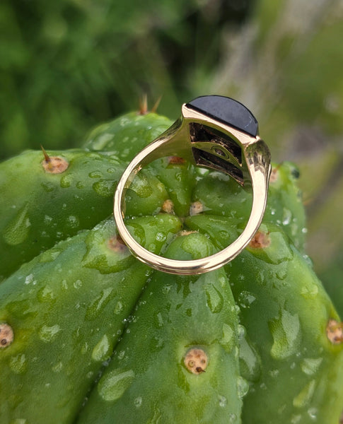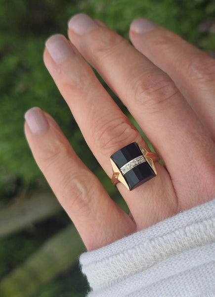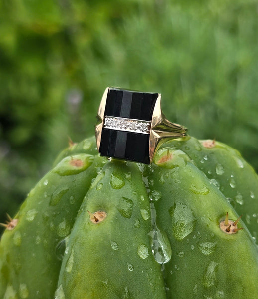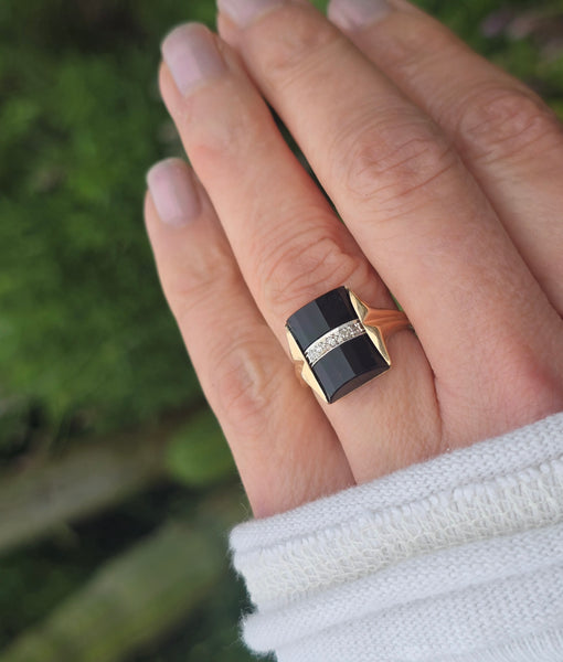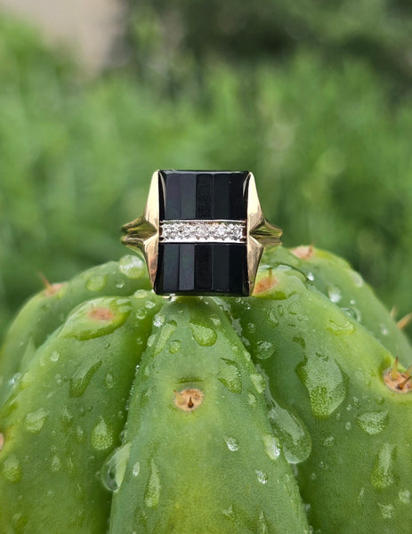 - 14k gold two tone vintage black onyx and diamond estate ring