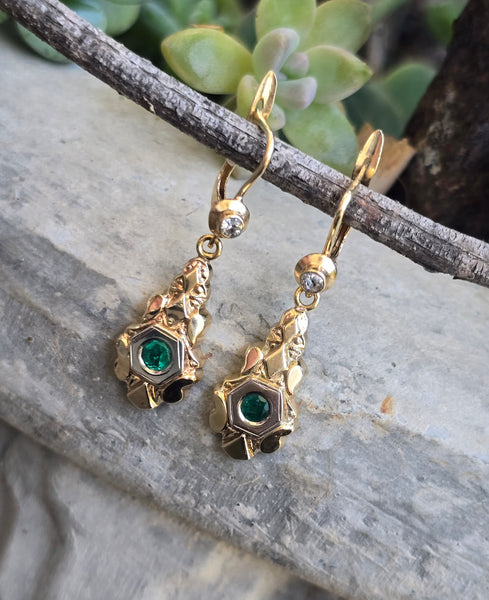 • 12k gold Art Deco diamond and emerald vintage lever back earrings