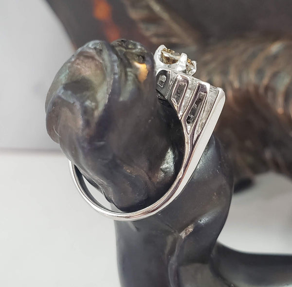 Ring can be resized within reason by our local jeweler or likely yours. Please contact us prior to purchasing if you are interested in our jeweler's resizing services. Rhodium plating also available upon request.