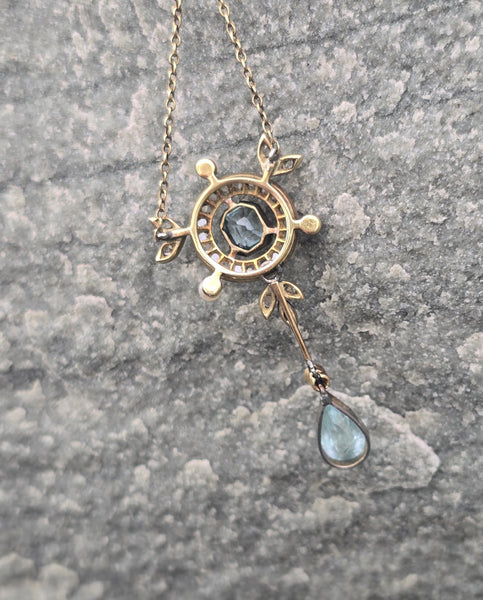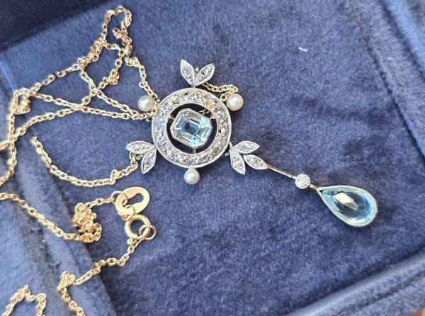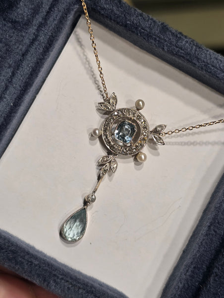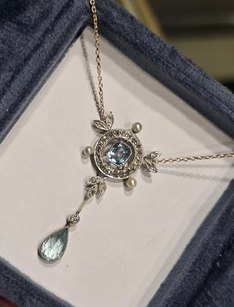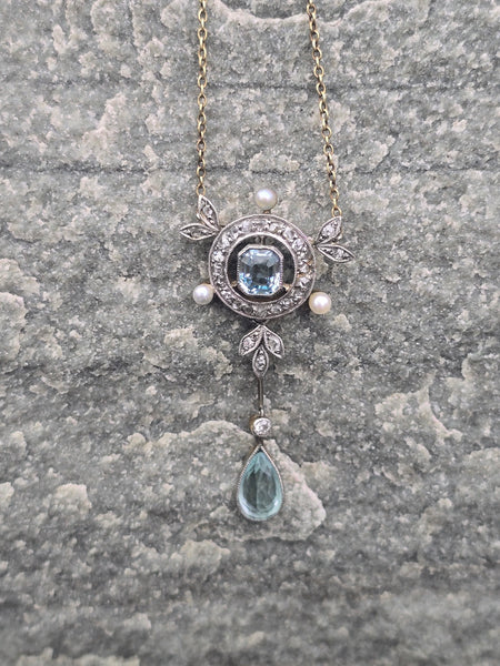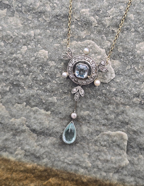 - platinum top and 14k gold two-tone aquamarine, pearl and diamond floral Edwardian necklace pendant lavaliere