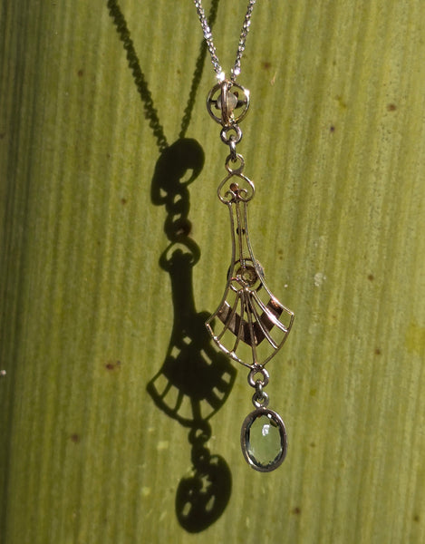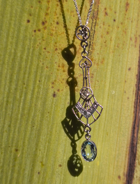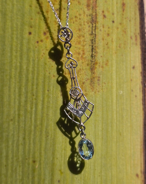 - platinum top and 14k gold two-tone aquamarine and diamond floral filigree necklace pendant lavaliere