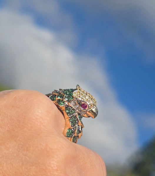 - 14k gold garnet, sapphire, ruby and diamond parrot bird estate ring