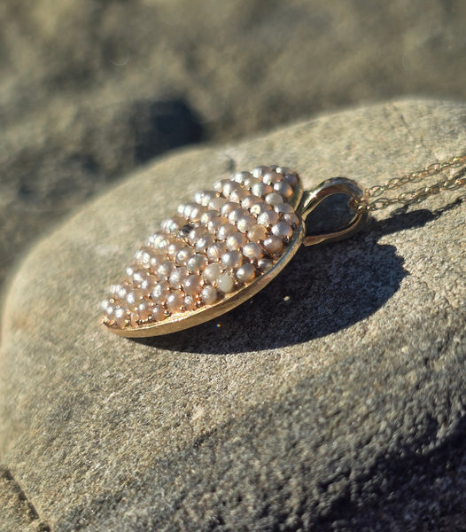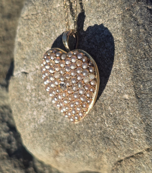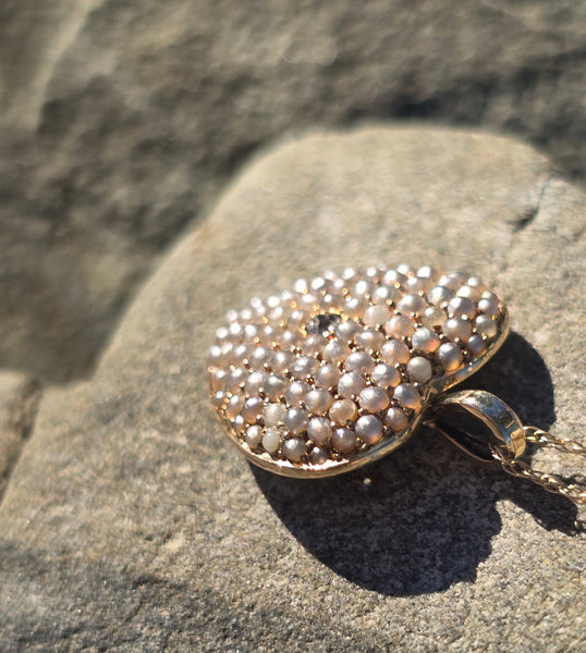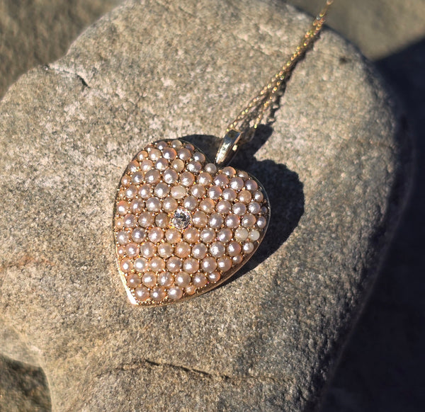 - 14k gold Victorian seed pearl and diamond heart pendant necklace charm