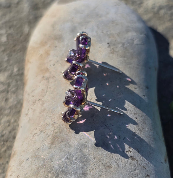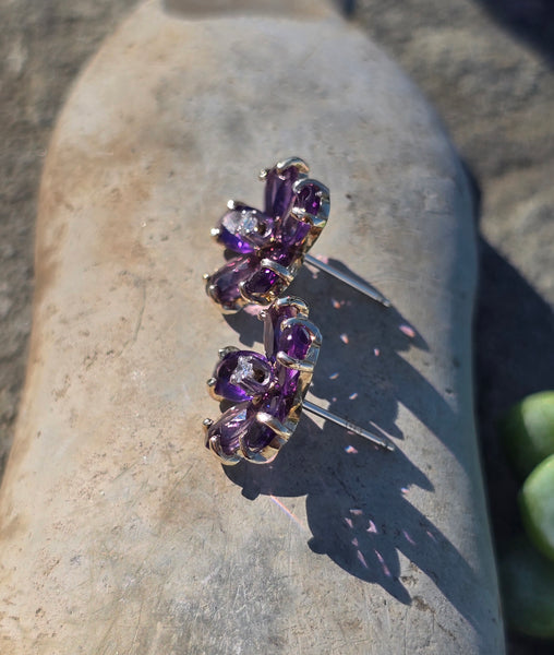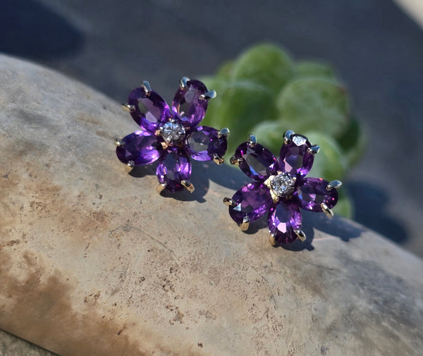 - 14k yellow gold amethyst and diamond estate floral flower earrings studs