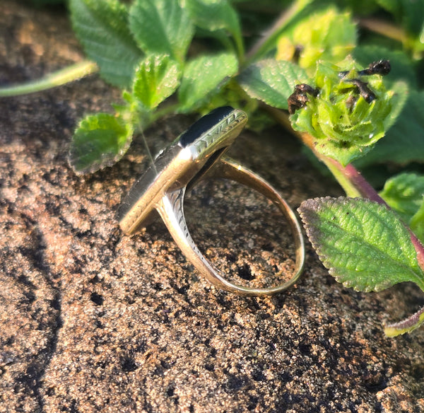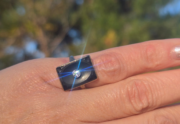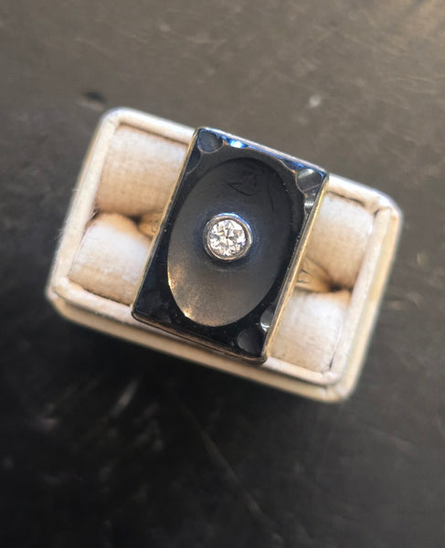- 14k gold two tone vintage black onyx and diamond estate ring