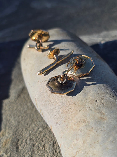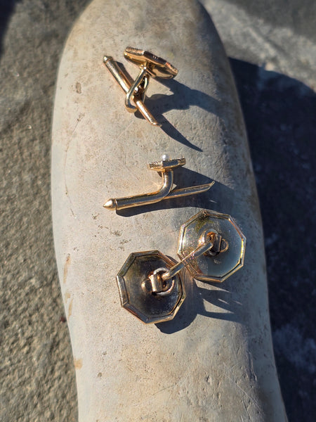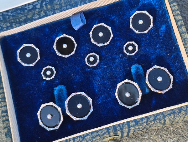 - 14k gold two-tone Art Deco onyx and seed pearl 9-piece cufflink set
