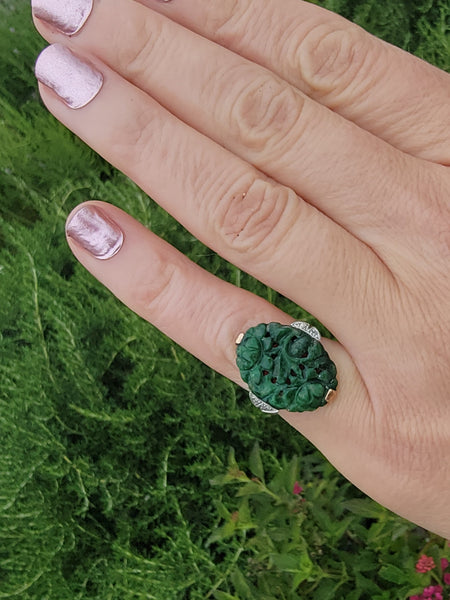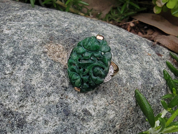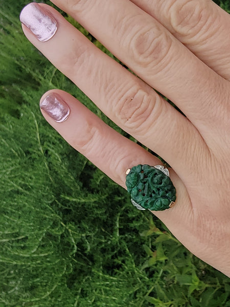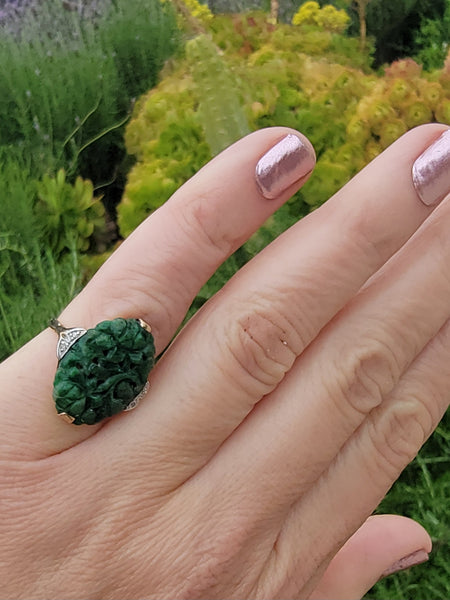- 10K yellow gold jade and diamond Deco ring