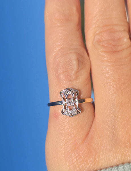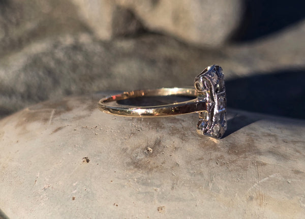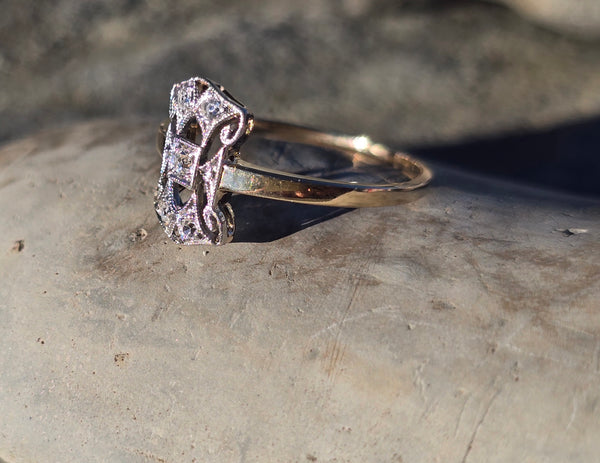 - 14k gold two tone diamond filigree antique c.1930's ring
