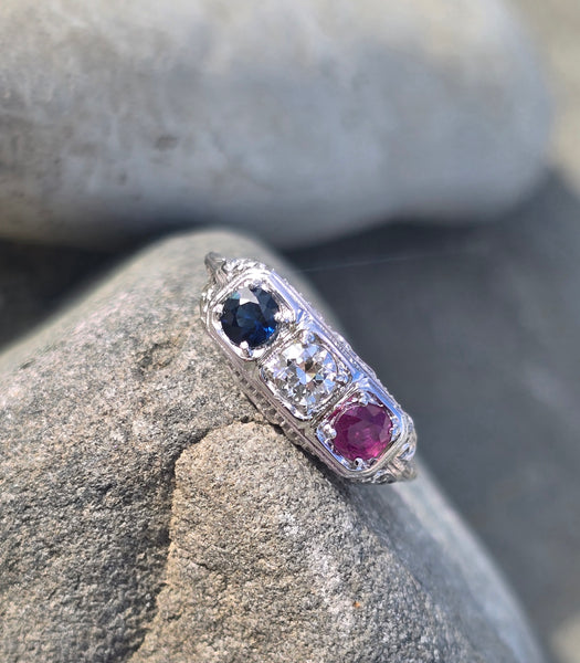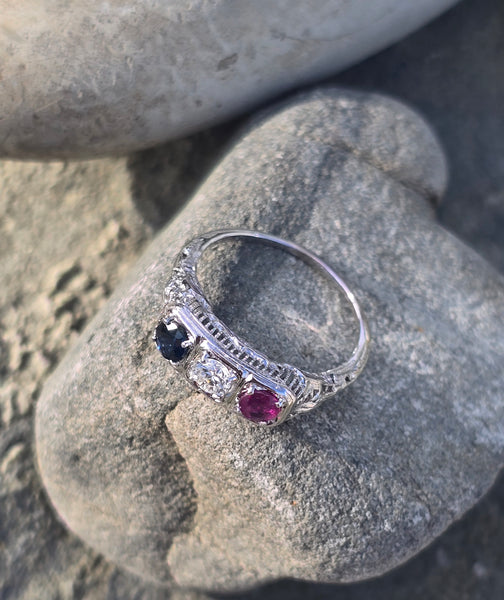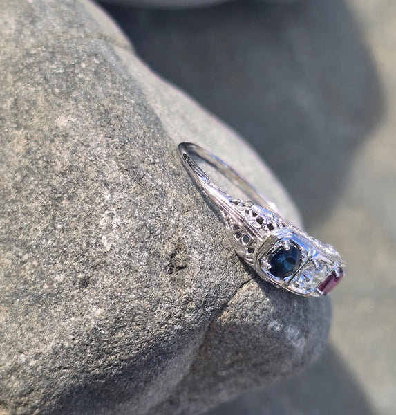 - 14k white gold c.1920's 3 stone red, white and blue filigree ring
