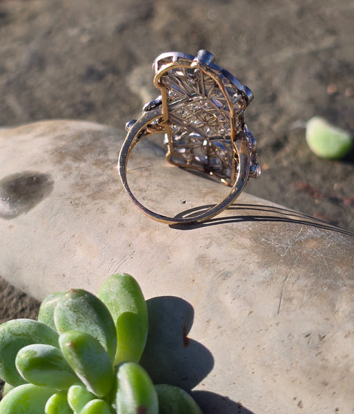 - Platinum and 14k gold two tone Edwardian pearl and diamond glove shield ring